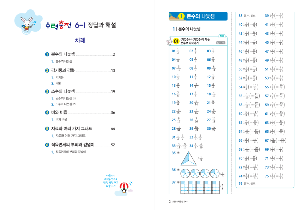 이 교재는 6학년 1학기 수학에서 꼭 알아야 할 단원들을 빠짐없이 다루고 있습니다. ‘분수의 나눗셈’, ‘각기둥과 각뿔’, ‘소수의 나눗셈’, ‘비와 비율’, ‘여러 가지 그래프’, ‘직육면체의 부피와 겉넓이’ 등 중요한 단원이 포함되어 있으며, 각 단원마다 문제를 점점 난이도 있게 배치하여 연산 실력을 차근차근 쌓아갈 수 있도록 돕습니다. 문제의 양이 부담스럽지 않으면서도 충분한 연습이 가능하도록 구성되어 있어, 아이가 싫증내지 않고 끝까지 풀 수 있는 것이 장점입니다. 아래 링크를 통해 수력충전 6-1 답지를 열람할 수 있습니다.