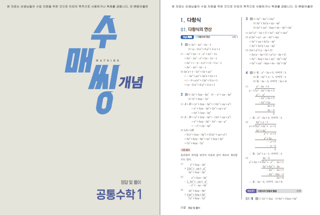 수매씽 개념 기본서 공통수학 1은 고등 1학년이 처음으로 공통수학을 시작할 때 부담을 덜어주도록 설계된 교재입니다. 교과서 순서를 따르면서도 설명을 조금 더 풀어서 적어놓은 방식이라 중학교 수학에서 바로 이어지듯이 읽을 수 있습니다. 이용자들 사이에서도 “교과서보다 말투가 친절하다”, “선생님이 칠판에 적어주는 순서 그대로라 따라가기 쉽다”는 말이 있었는데, 이 부분이 이 책의 핵심 장점처럼 보입니다. 특히 다항식 연산이나 이차방정식처럼 헷갈리기 쉬운 단원은 ‘중학교에서 했던 것’과 ‘고등에서 새로 배우는 것’을 나눠서 설명해 줘서 기초가 약한 학생도 다시 시작하기 좋습니다. 아래 수매씽 개념 공수1 답지를 올려두도록 하겠습니다.