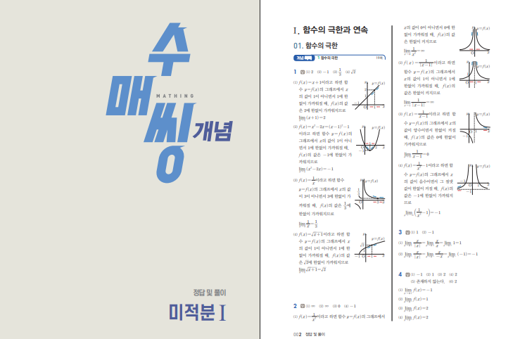 수매씽 개념 기본서 미적분1 (2026년)은 공통수학과 대수까지 학습을 마친 학생이 본격적으로 미적분 과정으로 올라갈 때 쓰기 좋도록 만든 개념서입니다. 미적은 함수의 극한과 연속, 미분, 적분이 한 권에 모두 들어 있어서 개념이 한 번만 꼬여도 뒤에 있는 단원을 못 따라가는 일이 많은데, 이 책은 교과서보다 말이 부드럽고 예시를 많이 넣어서 왜 이 정의가 필요한지부터 차근차근 설명해 줍니다. 특히 극한을 “값에 가까워지는 과정”으로 이해시키고, 연속을 “그래프가 뚝 끊기지 않는 성질”로 연결해 주기 때문에 중학생도 읽으면 흐름은 따라갈 수 있는 수준으로 쓰여 있습니다. 출판사에서 말하는 것처럼 이번 판도 2022 개정 교육과정 반영본이라 학교 수업과 범위가 어긋나지 않습니다. 아래 수매씽 개념 미1 답지 pdf 파일을 올려두도록 하겠습니다.