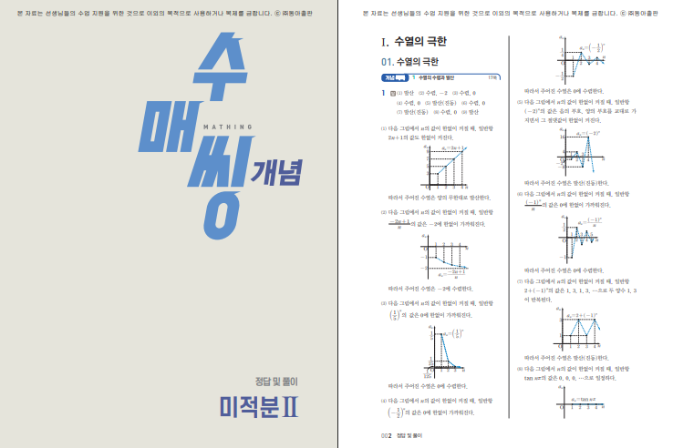 이 책은 미적분1을 이미 한 번 끝냈고 이제 수능 범위 전체를 완성해야 하는 고3 학생, 미적분을 선택한 수험생 중에서 계산 실수를 자주 하거나 미분·적분이 끊겨 보이는 학생, 학원 수업 진도를 따라가면서도 개념을 다시 정리할 교재가 필요한 학생에게 적합합니다. 학습할 때는 한 번에 많은 단원을 넘기기보다 하루에 소단원 하나씩 개념과 예제를 완전히 끝내고, 적분 파트는 반드시 다시 한 번 복습해 공식을 몸에 익히는 것이 좋습니다. 본문에 22개정교육과정 수매씽 개념 미적분2 답지 pdf 파일을 첨부해두었습니다. 표지를 꼭 확인하시길 바랍니다.