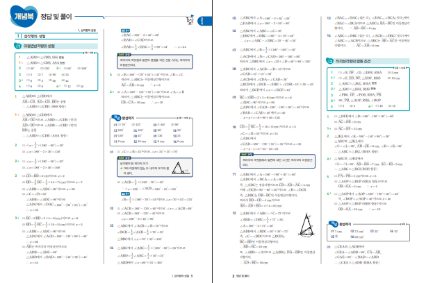 또한 개념을 한 번에 끝내지 않고 기초 설명, 본개념, 집중 코칭처럼 작은 덩어리로 나눠 주는 구성이 실제로 도움이 된다는 반응이 있습니다. 중학교 2학년 수학은 1학년 때보다 추상적인 내용이 많아서 한 번에 이해가 안 되는 경우가 많은데, 이 책은 “이게 왜 그런지”를 한 단계 더 내려가서 설명해 주기 때문에 복습용으로도 좋다고 합니다. 서술형 대비 부분도 갑자기 어려운 문제를 주는 것이 아니라 앞에서 했던 개념을 문장으로 쓰게 만드는 식이라서, 서술형을 어려워하는 학생도 부담이 적다는 후기가 보입니다. 아래 링크를 통해 개념 수매씽 2-2 답지를 열람할 수 있습니다.