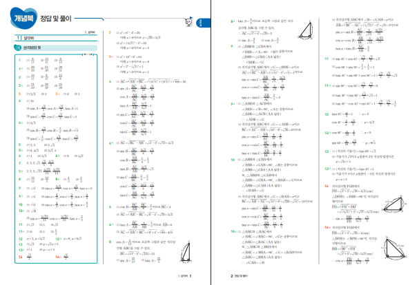 수매씽 개념 중학 수학 3-2는 중학교 과정의 마지막 학기 내용을 한 번에 정리할 수 있도록 만든 교재입니다. 3학년 2학기에는 삼각비, 원의 성질, 자료의 분포처럼 갑자기 내용이 바뀌는 단원이 이어지는데, 이 책은 그 흐름을 교과서 순서대로 정리해 주면서도 개념을 단계별로 쌓을 수 있게 구성되어 있습니다. 특히 삼각비 단원은 도형을 먼저 이해해야 공식이 보이는데, 이 책은 그림과 설명을 같이 보여 주는 형태라서 처음 삼각비를 배우는 학생도 각도와 길이의 관계를 자연스럽게 받아들이도록 도와줍니다. 교재 설명에 나와 있는 것처럼 기초→개념→집중 코칭 순서로 설명을 나눈 점이 3학년 교재라도 어렵지 않게 느껴지게 하는 부분입니다. 아래 개념 수매씽 3-2 답지 pdf 파일을 올려두도록 하겠습니다.