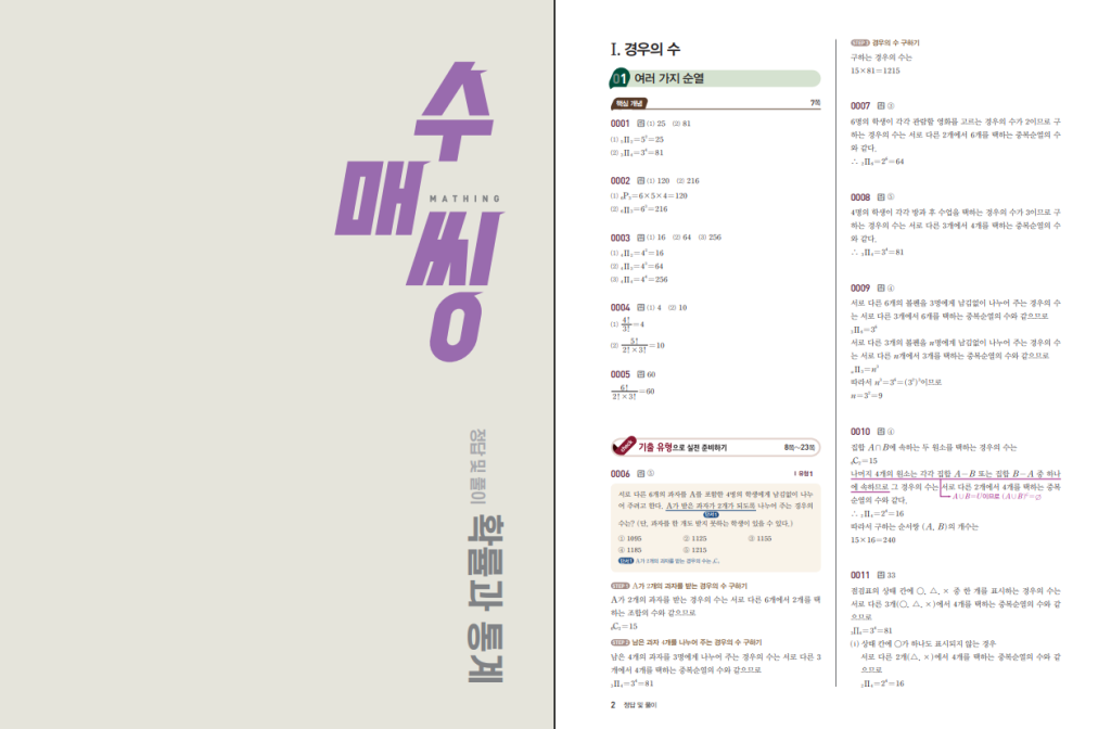 수매씽 확률과 통계 문제 기본서 (2026년)는 2022 개정 교육과정에 맞춰 확통을 한 권으로 끝내도록 만든 문제 중심 교재입니다. 공통수학1·2, 대수, 미적분1까지 수매씽으로 올라온 학생이라면 같은 스타일이라서 바로 이어서 풀기 좋습니다. 확률과 통계는 공식은 짧은데 문제에서 상황이 살짝만 바뀌어도 틀리기 쉬운 과목이라, 유형을 많이 풀어보는 게 제일 중요합니다. 이 책은 경우의 수에서 시작해 확률, 조건부확률, 확률분포, 통계적 추정까지 고등 과정 전체를 빠짐없이 담아서 내신과 수능을 동시에 대비하도록 구성돼 있습니다. 아래 수매씽 확통 답지 pdf 파일을 올려두도록 하겠습니다. 교육과정이 바뀌었으므로 표지를 확인하시길 바랍니다.