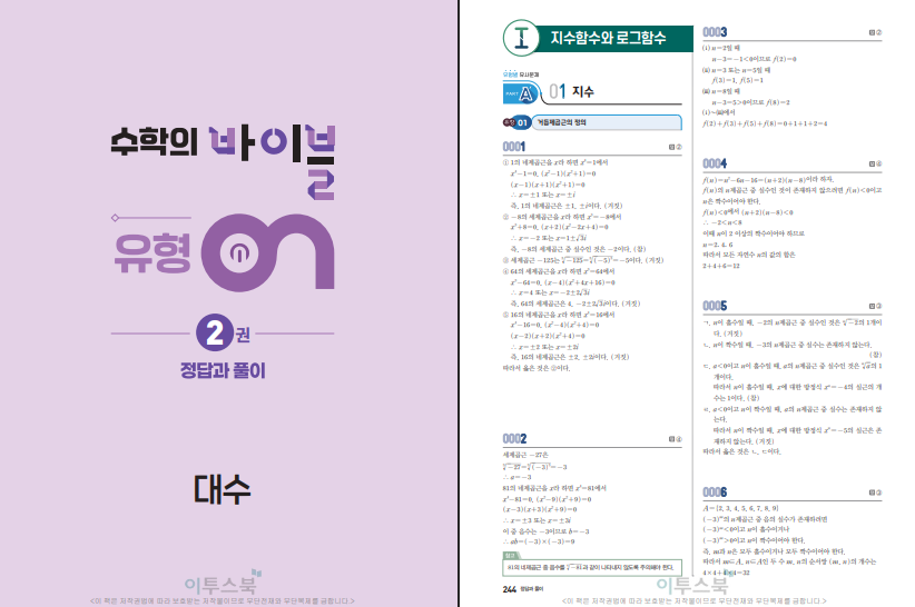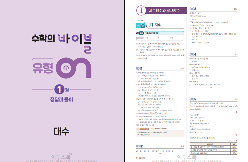 수학의 바이블 유형ON 대수 (2026년)은 2022 개정 교육과정을 반영한 고2 1학기용 유형서입니다. 대수에서 처음 크게 부딪히는 단원이 지수·로그, 삼각함수, 수열인데, 이 책은 그 내용을 “유형”으로 정리해 한 번에 잡아주려는 성격이 강합니다. 개념을 읽고 바로 문제로 넘어가면 흐름이 끊기기 쉬운데, 이 교재는 자주 나오는 형태를 먼저 보여주고 같은 틀의 문제를 여러 번 풀게 하면서 실력을 쌓게 합니다. 그래서 선행을 하는 학생이나, 내신 대비로 범위를 빠르게 정리하고 싶은 학생에게도 활용도가 높습니다. 아래 수학의 바이블 유형온 대수 답지를 첨부해두도록 하겠습니다.