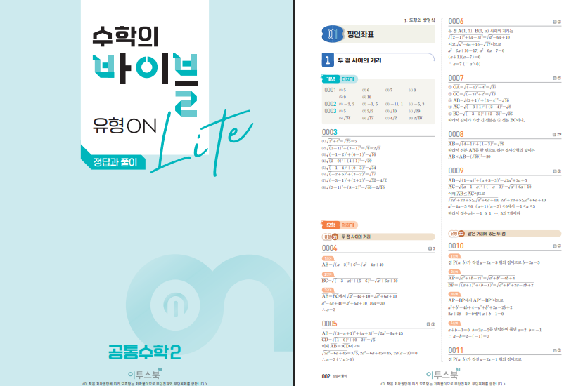 수학의 바이블 유형ON 라이트 공통수학2(2026년)는 공통수학2를 처음 접하는 학생도 부담 없이 시작할 수 있도록 구성된 교재입니다. 공통수학2는 좌표와 도형, 집합과 명제, 함수와 그래프처럼 내용의 성격이 자주 바뀌는 과목이라 흐름을 놓치기 쉽습니다. 이 교재는 처음부터 깊은 난도로 들어가기보다, 개념을 빠르게 정리하고 바로 유형 문제로 연결해 주는 방식이라 공부의 출발선에 서기 좋습니다. 특히 학원에서 진도를 나간 뒤 부교재로 활용하거나, 예비 고등학생이 혼자 미리 공부하기에도 부담이 크지 않은 편입니다. 아래 수학의 바이블 유형온 라이트 공수2 pdf 답지를 첨부해두도록 하겠습니다.