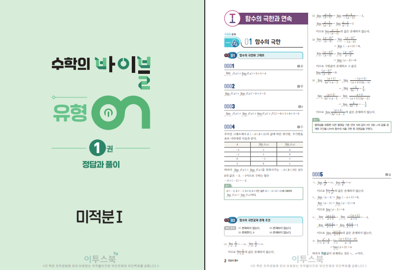 이 교재의 강점은 해설이 비교적 자세하다는 점입니다. 혼자 공부할 때 가장 힘든 부분이 문제를 틀렸을 때 이유를 모른 채 넘어가는 상황인데, 유형ON 미적분1은 풀이 과정이 단계별로 설명되어 있어 스스로 생각의 흐름을 따라가기에 좋습니다. 왜 이 식을 미분해야 하는지, 적분 구간을 어떻게 설정하는지 같은 핵심 판단 과정을 해설에서 확인할 수 있어 자습용 교재로도 적합합니다. 틀린 문제를 해설과 함께 다시 풀어보면 같은 유형에서의 실수가 점점 줄어드는 것을 느낄 수 있습니다.