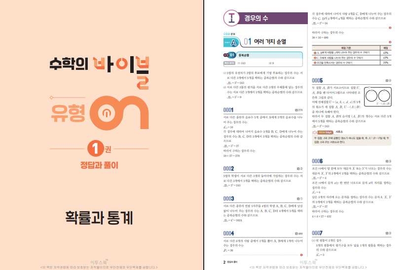 수학의 바이블 유형ON 확률과 통계는 고등학교 확률과 통계를 처음 체계적으로 정리하려는 학생들에게 많이 선택되는 유형서입니다. 이 시리즈는 학교 수업 부교재로 자주 활용되어 왔고, 학원에서도 보조 교재로 꾸준히 사용되는 교재라는 점에서 신뢰도가 높은 편입니다. 확률과 통계는 개념을 이해하지 못하면 문제 풀이가 막히기 쉬운데, 이 책은 자주 출제되는 유형을 중심으로 학습 흐름을 잡아 주어 부담을 줄여줍니다. 아래 22개정 확통 수학의 바이블 유형온 답지를 PDF 파일로 첨부해두겠습니다.
