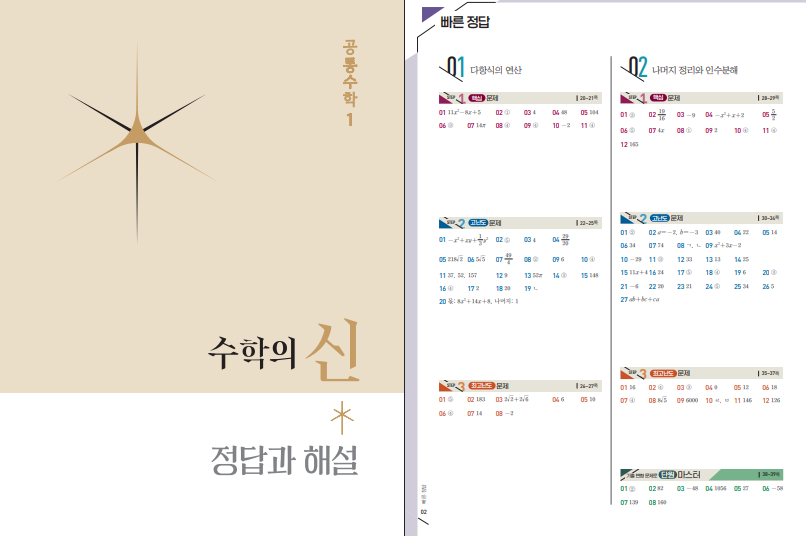 수학의 신 고등 공통수학 1(2025)은 2022 개정 교육과정에 맞춘 상위권 심화 문제집으로, “핵심 개념→실전 개념”을 권두에 압축 제시하고 본문에서 고난도까지 끌어올리는 구조가 돋보입니다. 난이도 안내가 ‘어려움’으로 표기된 만큼 개념서 1회독 이후 내신 상위권·모의고사 1등급을 목표로 하는 학생에게 특히 적합합니다. 단순 계산을 넘어 조건 해석과 아이디어 전개를 요구하는 문항이 많아, 문제 풀이 과정에서 개념의 쓰임을 몸에 익히기 좋습니다. 아래 수학의신 공통수학1 답지 pdf 파일을 올려두도록 하겠습니다.