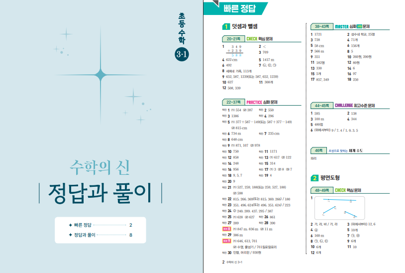 구성 면에서 가장 큰 장점은 책 앞에 단원 핵심과 확장 개념, 상위권 풀이 비법을 모아둔 ‘핵심 개념’ 섹션입니다. 이후 대표 심화 문제를 Check→Practice→Master→Challenge의 4단계로 점층 학습하게 해 실력을 안정적으로 끌어올립니다. 같은 원리를 소재를 바꾸거나 조건을 변형·추가하며 반복 노출하는 설계가 돋보여, 한 유형만 익는 ‘패턴 암기’에 그치지 않고 새로운 문맥에도 개념을 전이하는 힘을 길러 줍니다. 풀이 과정에서 조건 읽기, 식 세우기, 검산까지 요구하는 문제 비중이 높아 서술·논리형 답안을 연습하기에도 유리합니다. 아래 링크를 통해 수학의신 초등 3-1 답지를 열람할 수 있습니다.