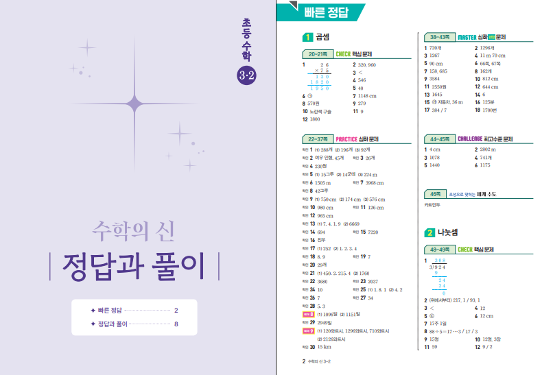 문항 구성은 대표 심화 문제를 Check→Practice→Master→Challenge의 4단계로 점층화해 같은 개념을 소재·조건을 바꿔 반복 노출합니다. 이 과정에서 조건 분석, 전략 선택, 검산까지 요구하는 문제가 많아 계산력뿐 아니라 논리적 서술과 문제 해석력이 함께 자랍니다. 단순 패턴 암기가 아니라 “왜 이 방법이 맞는가”를 확인하도록 유도하는 풀이 흐름이 돋보이며, 오답 해석 역시 원인(개념 오해/조건 누락/계산 실수)별로 되짚기 좋게 짜여 있습니다. 상·중 난도가 고르게 배치되어 있어 상위권 학생은 속도와 정확도를, 예비 상위권 학생은 약한 유형을 골라 보완하기에 효율적입니다. 아래 링크를 통해 수학의신 초3-2 답지를 열람할 수 있습니다.