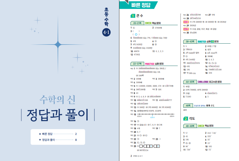 문항 구성은 대표 심화 문제를 Check→Practice→Master→Challenge의 4단계로 점층화하여 같은 개념을 소재·조건을 바꾸어 재노출합니다. 조건 해석, 전략 선택, 검산까지 요구하는 문제가 많아 계산력과 함께 논리적 서술력이 함께 자랍니다. 해설은 정답만 제시하지 않고 실수 포인트와 대체 전략을 짚어 재발을 막는 데 도움을 줍니다. 단원 단위로는 상·중·고 난도가 균형 있게 배치되어 있어 상위권은 속도·정확도를, 예비 상위권은 약한 유형 보완을 노리기 좋습니다. 아래 링크를 통해 수학의신 초4-1 답지를 열람할 수 있습니다.