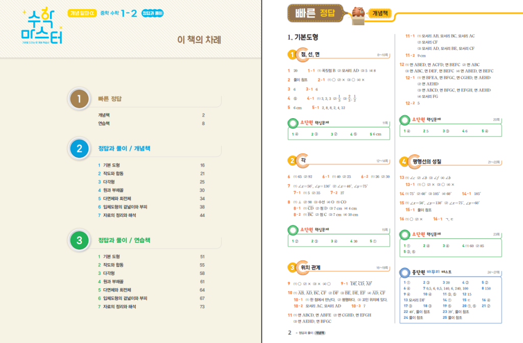 이 교재는 기본 도형부터 작도와 합동, 다각형, 원과 부채꼴, 입체도형, 그리고 자료의 정리와 해석까지 2학기 핵심 단원을 체계적으로 다루고 있습니다. 각 단원은 이전 개념과 연결되도록 구성되어 있어 학습 흐름이 끊기지 않고 이어집니다. 아래 링크로 개념 알파 수학마스터 1-2 답지를 열람하면서 문제 풀이 후 바로 확인하는 방식으로 공부하면 개념을 더 확실하게 정리할 수 있습니다.