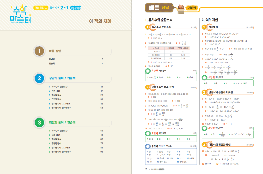 이 교재는 유리수와 순환소수부터 시작해 식의 계산, 일차부등식, 연립방정식, 일차함수까지 중2 과정의 핵심 단원을 체계적으로 다루고 있습니다. 각 단원은 단계적으로 이어지며, 개념 간 연결이 자연스럽게 이루어지도록 구성되어 있습니다. 아래 링크로 중학 수학 마스터 개념 알파 2-1 답지를 열람하면서 문제 풀이 후 바로 확인하는 방식으로 공부하면 개념을 더 확실하게 정리할 수 있습니다.