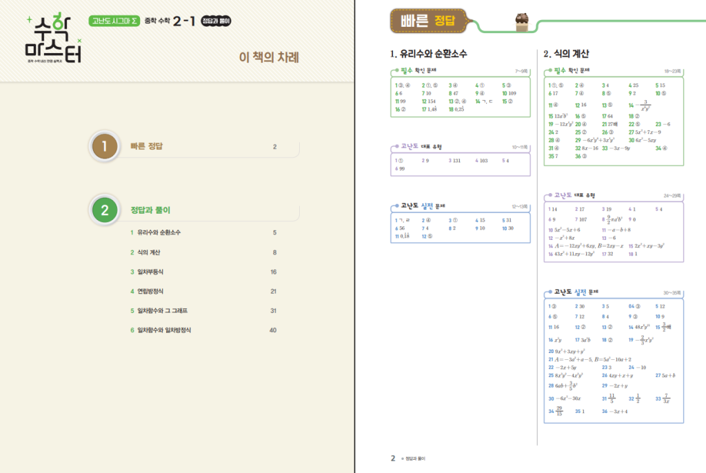 이 교재는 유리수와 순환소수, 식의 계산, 일차부등식, 연립방정식, 일차함수 등 중2 1학기 핵심 단원을 기반으로 고난도 문제를 체계적으로 다루고 있습니다. 각 단원은 대표 고난도 유형을 중심으로 구성되어 있어 문제를 풀면서 자연스럽게 개념을 다시 정리할 수 있도록 설계되어 있습니다. 아래 링크로 중학 수학 마스터 고난도 시그마 2-1 답지를 열람하면서 풀이 과정을 확인하면 학습 효과를 더욱 높일 수 있습니다.