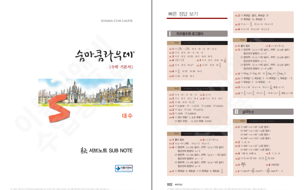 전체적으로 난이도는 기본서 수준이지만 개념을 깊이 있게 다루고 있어 기초를 확실하게 다지기에 적합한 교재입니다. 개념을 완벽하게 이해하고 다양한 문제를 통해 실력을 키우고 싶은 학생에게 추천할 수 있으며, 꾸준히 학습하면 고등 수학 전반에 대한 자신감을 높이는 데 큰 도움이 됩니다. 강의와 병행하면 이해도가 더욱 높아져 학습 효과가 매우 좋습니다. 교육과정이 개정될 때마다 내용이 달라질 수 있으므로 표지를 반드시 확인하시고, 본문에 22개정 숨마쿰라우데 기본서 대수 답지 pdf 첨부해 두었습니다. 필요하신 분들은 이용하시길 바랍니다.