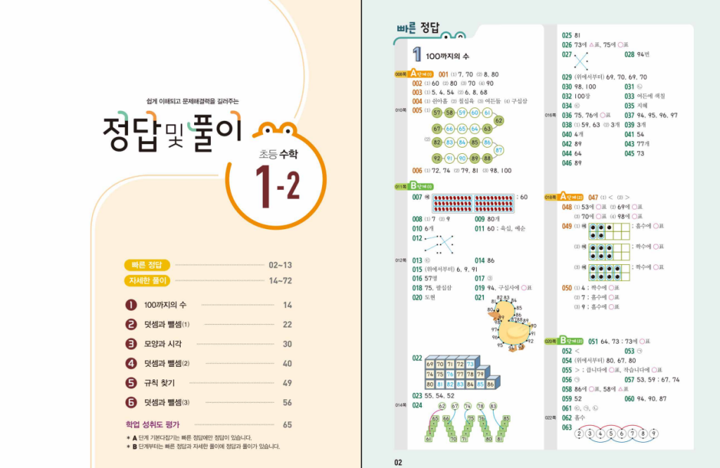 단원은 1단원 100까지의 수, 2단원 덧셈과 뺄셈(1), 3단원 모양과 시각, 4단원 덧셈과 뺄셈(2), 5단원 규칙 찾기, 6단원 덧셈과 뺄셈(3) 순서로 되어 있습니다. 숫자 범위가 100까지 넓어지고, 덧셈·뺄셈이 여러 번 나오는 만큼 연산 연습량이 꽤 필요해지는 학기인데, 이 책은 같은 개념을 다양한 형태의 문제로 반복해서 다루면서 아이가 헷갈리는 부분을 자연스럽게 잡아 주는 구조입니다. 모양과 시각, 규칙 찾기 단원도 함께 들어 있어 단순 계산만이 아니라 ‘생각하는 문제’도 같이 익히도록 되어 있습니다.
