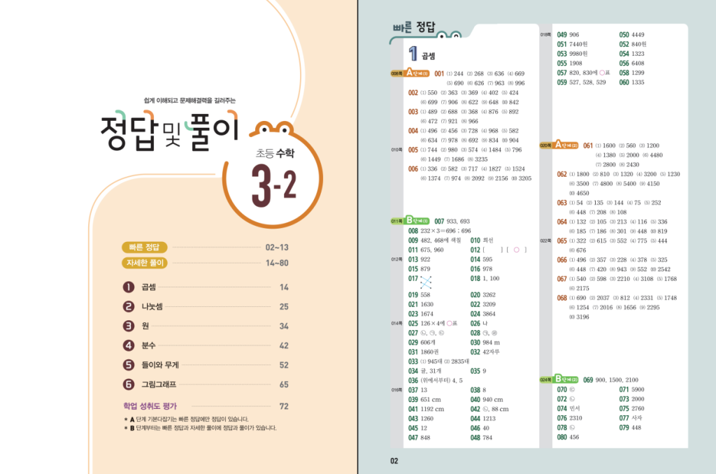 단원 구성은 1단원 곱셈, 2단원 나눗셈, 3단원 원, 4단원 분수, 5단원 들이와 무게, 6단원 그림그래프로 이루어져 있습니다. 3학년 2학기부터는 곱셈·나눗셈이 조금 더 깊어지고, 분수와 원, 들이·무게 같은 단원이 본격적으로 등장해서 어렵게 느껴지기 쉬운데, 이 내용을 작은 유형 단위로 쪼개서 반복 연습할 수 있게 만들어 둔 점이 특징입니다. 한 단원 안에서도 기본 개념 → 대표 유형 → 응용 문제로 점점 난이도가 올라가도록 짜여 있어서, 아이가 어디까지 이해했는지 확인하기 좋습니다.