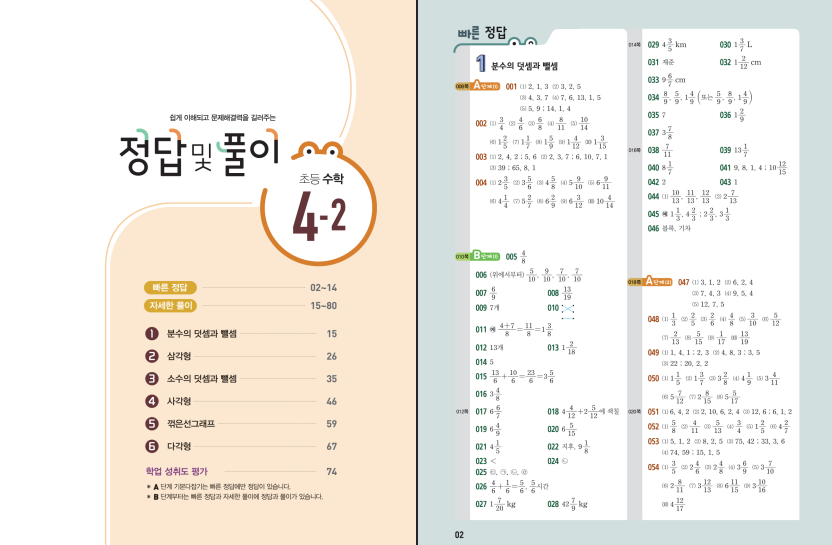 실제 활용법으로는 학교 진도에 맞춰 개념을 배운 날에는 해당 단원의 A, B- 문제까지만 풀게 하고, 주말이나 시험 기간에는 틀렸던 문제와 B+, C 단계, 서술형 문제만 골라서 한 번 더 풀어 보게 하는 방식이 무난합니다. 연산은 따로 연산 교재를 병행하고, 쎈에서는 개념 이해와 서술형, 응용 문제 중심으로 다뤄 주면 부담을 줄이면서도 실력을 꾸준히 끌어올릴 수 있습니다. 4학년 2학기부터 분수·소수와 도형이 어렵게 느껴지기 시작한 학생, 그리고 중학교를 준비하는 기초를 4학년부터 조금씩 쌓고 싶은 가정에서 메인 문제집으로 사용하기에 알맞은 구성입니다. 본문에 쎈 초등수학 4-2 답지를 첨부해두었습니다. 표지를 꼭 확인하시길 바랍니다.
