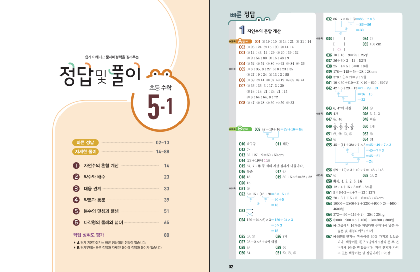 단원 구성은 1단원 자연수의 혼합 계산, 2단원 약수와 배수, 3단원 대응 관계, 4단원 약분과 통분, 5단원 분수의 덧셈과 뺄셈, 6단원 다각형의 둘레와 넓이로 이어집니다. 먼저 간단한 개념 정리와 예제 문제로 흐름을 잡아 주고, 바로 아래에 비슷한 유형의 문제를 여러 개 배치해 스스로 풀어 보게 하는 방식입니다. 특히 약분·통분과 분수의 덧셈·뺄셈, 다각형의 넓이 단원은 중학교에서도 계속 쓰이는 내용이라, 5학년 때 유형별로 충분히 연습해 두면 이후에 훨씬 편해집니다.