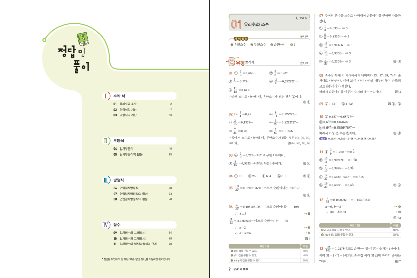 구성은 1학기에서 가장 중요한 수와 식부터 시작합니다. 유리수와 소수, 단항식과 다항식 계산은 이후 부등식과 연립일차방정식, 일차함수로 이어지는 기본기라서 반복이 꼭 필요한데, 이 책은 같은 유형을 짧은 간격으로 묶어두어 계산 감각을 빠르게 올릴 수 있도록 되어 있습니다. 뒤쪽에서는 일차부등식과 활용, 연립일차방정식과 활용, 그리고 일차함수와 그래프까지 연결되도록 해 두어서 중2 1학기 시험 범위를 한 권으로 묶어 대비할 수 있습니다.