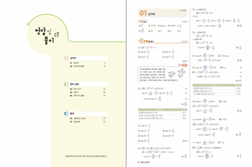 구성은 먼저 삼각비 단원에서 높이, 거리, 기울기 같은 문제를 삼각비로 바꾸는 과정을 연습하게 하고, 이어서 원과 직선, 원주각, 원을 활용한 각의 크기 구하기로 넘어가도록 되어 있습니다. 이 부분은 문제를 많이 풀어봐야 각도 관계가 눈에 들어오기 때문에 대표문제 다음에 바로 비슷한 문제를 붙여 둔 구성이 도움이 됩니다. 마지막 통계 단원에서는 대푯값과 산포도, 상관관계까지 다루기 때문에 서술형이나 수행평가 대비로도 활용할 수 있습니다. 중3 후반부에 자주 나오는 그래프 해석형 문제도 들어 있어 시험 준비에 맞춰 풀기 좋습니다.