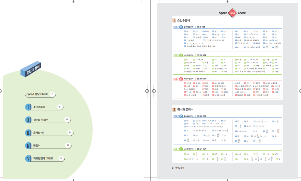 단원은 소인수분해, 정수와 유리수, 문자와 식, 방정식, 좌표평면과 그래프로 이어지며, 각 단원 안에서 원리 확인, 기본 문제, 응용 문제의 순환을 반복해 실수를 줄이는 연습을 하게 합니다. 예를 들어 정수와 유리수에서는 부호 규칙을 시각적으로 정리해 더하기와 곱하기를 혼동하지 않도록 돕고, 문자와 식에서는 말로 된 조건을 등식으로 바꾸는 과정을 한 단계씩 안내합니다. 방정식과 좌표 단원은 풀이 절차와 해석을 함께 묻는 문제가 많아, 답만 맞히는 연습이 아니라 이유를 설명하는 연습까지 챙길 수 있습니다. 아래 링크를 통해 에이급 중등수학 1-1 답지를 열람할 수 있습니다.