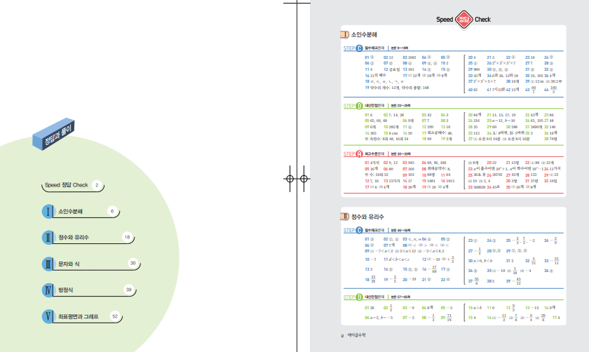 이 교재는 소인수분해를 시작으로 정수와 유리수, 문자와 식, 방정식, 좌표평면과 그래프까지 중1 1학기 핵심 단원을 체계적으로 다루고 있습니다. 각 단원은 개념 정리 후 다양한 유형의 문제를 풀어보는 구조로 되어 있어 이해와 적용이 동시에 이루어집니다. 문제 풀이 후 바로 해설을 확인하면서 틀린 부분을 정리하면 학습 효과를 더욱 높일 수 있습니다. 아래 링크로 A급 수학 중등 1-1 답지를 열람할 수 있습니다.