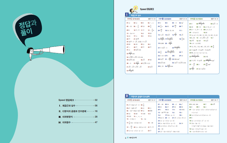 이 교재는 제곱근과 실수를 시작으로 다항식의 곱셈과 인수분해, 이차방정식, 이차함수까지 중3 1학기 핵심 단원을 체계적으로 다루고 있습니다. 각 단원은 개념 정리 후 다양한 유형 문제를 풀어보는 구조로 되어 있어 이해와 적용이 동시에 이루어집니다. 문제 풀이 후 바로 해설을 확인하면서 틀린 부분을 정리하면 학습 효과를 더욱 높일 수 있습니다. 아래 링크로 A급 수학 중학 수학 중3-상 답지를 열람할 수 있습니다.