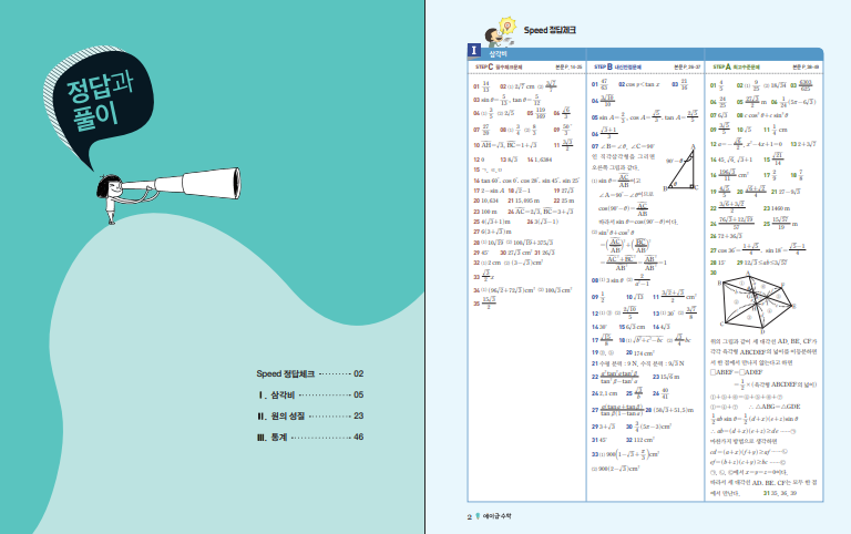 구성은 기본 문제부터 시작해 점차 난이도가 올라가는 단계형 구조로 되어 있어 학습 흐름이 자연스럽습니다. 다양한 유형의 문제를 통해 문제 해결력과 논리적 사고력을 함께 기를 수 있으며, 실전 감각을 키우는 데에도 도움이 됩니다. 리뷰를 보면 삼각비와 원 단원까지 체계적으로 구성되어 있어 시험 대비에 효과적이라는 평가가 많으며, 반복 학습을 통해 실력을 안정적으로 끌어올릴 수 있다는 의견이 있습니다.