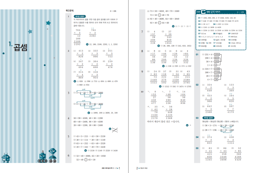 위 링크를 통해 초등 에이급수학 3-2 답지를 열람할 수 있습니다. 학습 방식은 개념 확인 뒤 즉시 적용 문제로 이해도를 점검하고, 소단원 복습과 단원 평가에서 틀린 문제를 다시 풀어 보게 하는 구조입니다. 풀이 과정을 적기 좋은 여백과 단계 안내가 있어 연산 이유를 스스로 말로 설명하는 연습에 적합합니다. 생활 장면을 활용한 문제들이 많아 왜 이 계산이 필요한지 이유를 자연스럽게 떠올릴 수 있고, 단원 말미의 정리 페이지로 약한 부분만 골라 보완하는 학습이 가능합니다. 가정 학습에서도 오늘 무엇을 하고 내일 무엇을 복습할지 계획을 세우기 쉽습니다.