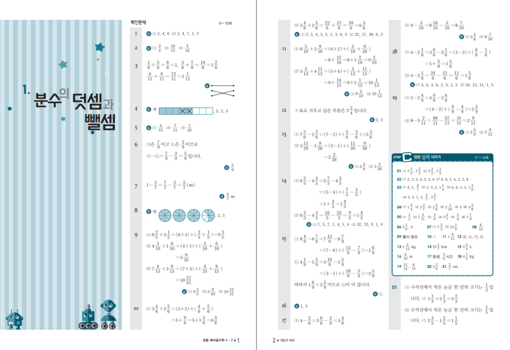 이 책은 4학년 2학기 내용을 안정적으로 정리하려는 학생, 계산은 가능하지만 설명에 약한 학생, 그래프와 도형에서 실수를 자주 하는 학생에게 특히 권합니다. 예습용으로는 개념과 예제까지만 가볍게 보고, 수업 후에는 기본·응용까지 풀며 단원평가로 마무리하면 학습 효율이 좋습니다. 최근 교육과정 반영판이 별도로 있으니 학교 교과서 버전과 맞춰 선택하면 더 알맞습니다. 학기 내내 이 책으로 규칙적으로 연습하면 분수·소수 계산의 정확도와 도형·자료 해석의 이해도가 함께 올라가 다음 학년 수학으로 이어지는 기반을 갖출 수 있습니다. 본문에 에이급수학 4-2 답지를 첨부해두었습니다. 교육과정이 바뀌고 있으므로 표지를 꼭 확인하시길 바랍니다.
