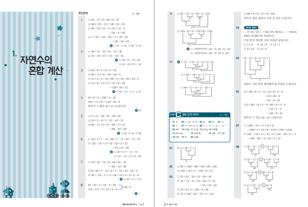 학습 흐름은 자연수의 혼합 계산으로 연산 규칙을 다지고, 약수와 배수에서 공약수·공배수 감각을 쌓은 뒤 규칙과 대응으로 식 세우기와 규칙 일반화를 연결합니다. 이어 약분과 통분, 분수의 덧셈과 뺄셈으로 분수 계산의 정확도를 끌어올리고, 마지막에 다각형의 둘레와 넓이로 도형 단원을 정리합니다. 각 단원은 개념확인부터 기본, 응용, 단원평가로 자연스럽게 난도가 올라가며 그림과 표가 선명해 도구 사용이 낯선 학생도 따라가기 어렵지 않습니다. 유사 유형을 묶어 반복하도록 구성되어 정확도와 속도를 함께 끌어올리기 좋습니다.