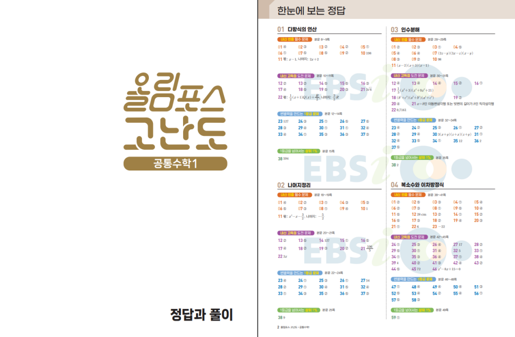 EBS 올림포스 고난도 공통수학 1 2026년은 학교 내신에서 상위권을 노리는 학생을 위한 고난도 맞춤 문제집입니다. 공수1은 다항식, 방정식과 부등식, 경우의 수, 행렬처럼 기초 개념 위에 응용이 바로 올라가는 단원이라서, 쉬운 문제만 풀면 시험에서 변별력 문항에 막히기 쉽습니다. 이 교재는 단원별로 출제 가능성이 높은 유형을 먼저 잡아주고, 점점 난도를 올려서 끝에는 진짜 어려운 문제까지 도전하게 만드는 흐름이라 실력을 끌어올리기에 좋습니다. 아래 올림포스 고난도 공수1 답지 pdf 올려두겠습니다.