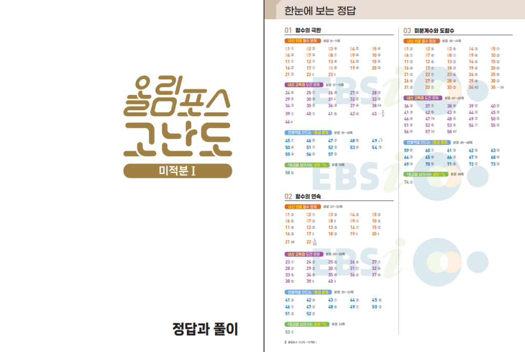 활용 방법은 먼저 필수 유형을 통해 정확도를 높이고, 이후 고난도 문제를 시간 재고 풀어보는 방식이 좋습니다. 오답은 해설을 읽고 끝내지 말고, 같은 유형을 며칠 뒤 다시 풀어 풀이 흐름이 자연스럽게 나오도록 만드는 것이 중요합니다. EBSi 무료 강의를 병행하면 개념 설명과 풀이 전략을 함께 정리할 수 있어 학습 효율이 높아지는데 이 점이 매우 좋습니다. 교육과정이 바뀔 때마다 개정되므로 표지 확인하시기 바랍니다. 본문에 22개정 EBS 올림포스 고난도 미적분1 답지 pdf 첨부해 두었습니다.