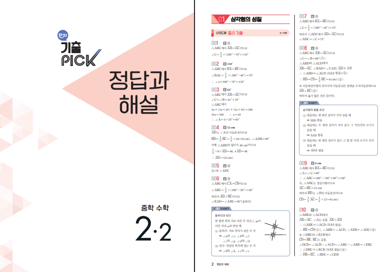 내신 준비의 핵심은 정확한 개념, 충분한 유형 노출, 그리고 오답을 바로잡는 루틴입니다. 이 책은 매일 정한 분량을 풀고 해설로 약점을 표시한 뒤, 일주일 단위로 틀린 문제만 다시 풀어 보는 방식에 특히 잘 맞습니다. 중간·기말 직전에는 단원 마무리와 모의고사형 세트를 돌리면 실전 감각이 빠르게 올라갑니다. 꾸준히 따라가면 계산 실수는 줄고, 서술형에서도 근거를 갖춘 답을 쓰는 힘이 생깁니다. 본문에 완자 기출픽 중등 수학 2-2 답지를 첨부해두었습니다. 표지를 꼭 확인하시길 바랍니다.