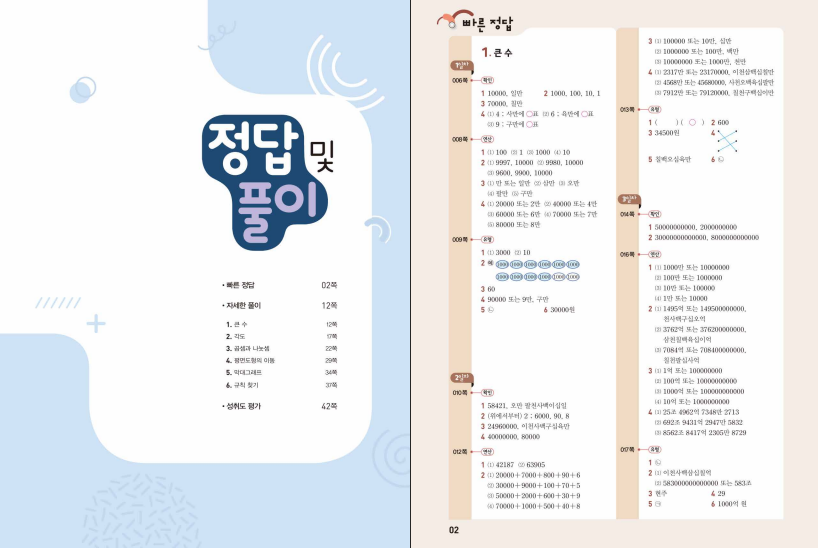 진짜 재밌는 일일수학 4-1은 초등 4학년 1학기 내용을 한 학기 분량으로 정리해 놓은 일일 학습용 수학 교재입니다. 4학년이 되면 갑자기 ‘큰 수’나 ‘각도’처럼 추상적인 단원이 늘고, 곱셈·나눗셈도 더 복잡해지기 때문에 아이가 수학을 어렵게 느끼기 쉬운 시기입니다. 이 책은 일상에서 볼 수 있는 상황 그림과 캐릭터 대화를 먼저 보여 준 뒤, 그 안에서 수학 개념을 자연스럽게 꺼내 설명하는 방식이라 글만 잔뜩 있는 교재보다 부담이 덜합니다. 2022 개정 교육 과정을 반영해 학교 교과서 흐름과 맞춰져 있어 예습·복습용으로 같이 쓰기 좋은 구조입니다. 아래 우공비 일일수학 4-1 답지 파일을 첨부해두도록 하겠습니다.