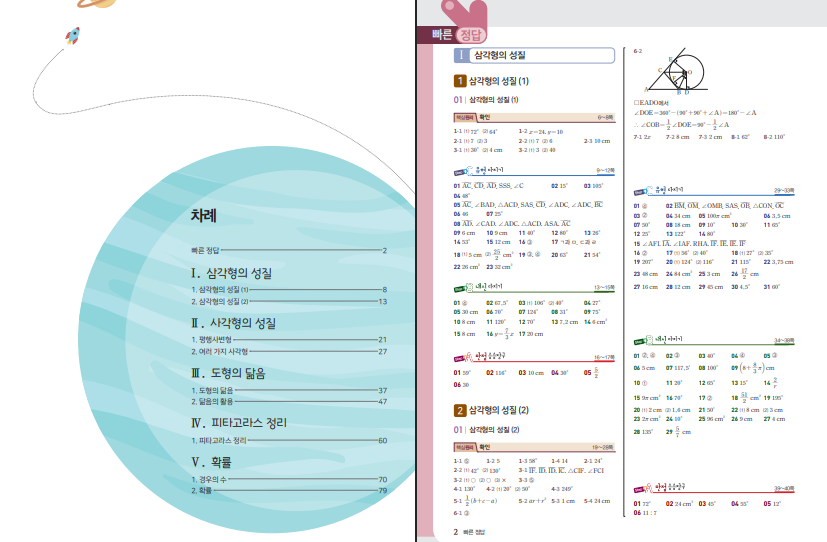 구성은 개념 설명, 확인 문제, 유형 문제로 이어지는 흐름으로 되어 있어 학습 단계가 자연스럽습니다. 특히 도형 단원에서 개념을 이해하기 쉽게 설명해주기 때문에 혼자 공부하는 학생도 부담 없이 따라갈 수 있습니다. 리뷰를 보면 설명이 자세하고 이해 중심으로 구성되어 있어 개념을 정확하게 잡는 데 도움이 된다는 평가가 있으며, 기초를 다지기에 적합한 교재라는 의견이 있습니다.