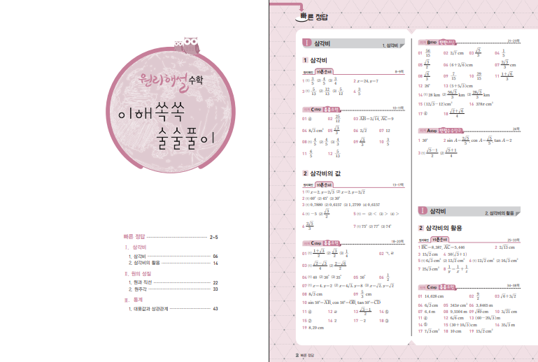 이 교재는 삼각비를 시작으로 원의 성질, 통계까지 중3 2학기 핵심 단원을 체계적으로 다루고 있습니다. 각 단원은 개념의 원리를 중심으로 자세하게 설명한 뒤, 이를 확인하는 문제로 이어지는 구조로 되어 있어 이해와 적용이 동시에 이루어집니다. 문제 풀이 후 바로 해설을 확인하면서 개념을 다시 정리하면 학습 효과를 더욱 높일 수 있습니다. 아래 링크로 A급 원리해설 중3-하 답지를 열람할 수 있습니다.
