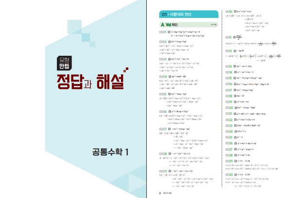 단원 구성도 공통수학 1에서 중요한 주제들을 빠짐없이 잡고 있습니다. 다항식의 연산과 나머지정리·인수분해로 식을 다루는 힘을 만들고, 복소수와 이차방정식으로 문제 풀이의 기본 체력을 쌓습니다. 이어서 이차방정식과 이차함수, 여러 가지 방정식, 연립일차부등식과 이차부등식까지 연결되면서, 식과 그래프를 함께 보거나 조건을 정리해 풀이로 이어가는 연습을 하게 됩니다. 뒤쪽의 경우의 수·순열·조합, 그리고 행렬의 연산은 단순 계산보다 ‘조건을 빠뜨리지 않고 정리하는 습관’이 점수 차이를 만들기 쉬운 부분이라서, 유형 연습이 특히 도움이 됩니다.