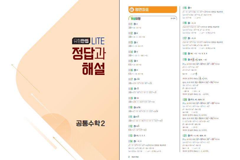 만렙시리즈를 바탕으로 이번 교육과정에 새로 출시된 유형만렙입니다. 조금 더 쉬운 버전인 라이트가 함께 출시된 것이 특징적 입니다. 공개된 책 소개와 구성을 확인하는 것이 좋습니다. 라이트라는 이름처럼 처음부터 어려운 기출 변형을 몰아치기보다, 공통수학 2에서 자주 나오는 기본 유형을 빠짐없이 익히고 실수를 줄이는 데 초점을 둔다고 이해하면 됩니다. 아래 링크를 통해 공통수학2 유형만렙 라이트 공통수학2 답지를 열람할 수 있습니다.