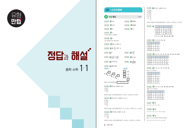 위 링크를 통해 유형 만렙 중1-1 답지를 열람할 수 있습니다. 단원 구성도 중1 1학기 핵심을 딱 잡고 있습니다. 수와 연산에서는 소인수분해, 최대공약수와 최소공배수, 정수와 유리수, 정수와 유리수의 계산이 나오고, 문자와 식에서는 문자의 사용과 식, 일차방정식, 일차방정식의 활용이 이어집니다. 좌표평면과 그래프에서는 좌표와 그래프, 정비례와 반비례가 들어 있습니다. 특히 정비례·반비례는 그래프와 식을 함께 보는 단원이라서, 문제를 많이 풀어보며 “식 ↔ 표 ↔ 그래프”로 바꿔 보는 연습이 잘 되는 편이 유리합니다.