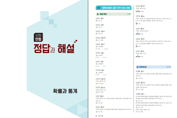 학습 흐름은 A단계에서 개념을 빠르게 확인하고, B단계에서 대표 유형을 완성한 다음, AB단계에서 실수를 줄이는 점검을 하고, C단계에서 난도를 올려 실력을 끌어올리는 구조입니다. 확통은 계산 실수도 많지만, 더 흔한 실수는 ‘경우를 빠뜨리거나 겹치게 세는 것’인데, 단계별로 점검하는 방식이 그런 실수를 줄이는 데 도움이 됩니다. 문제 수가 충분한 편이라 같은 단원을 짧게 끝내기보다는, 학교 시험이나 모의고사 직전에 “자주 틀리는 유형”을 반복해서 잡는 용도로 쓰면 효율이 좋습니다.