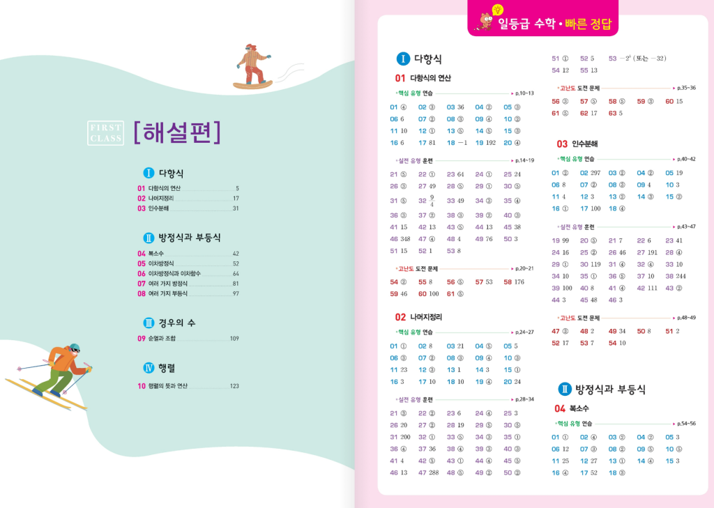 일등급 수학 공통수학 1은 2022 개정 교육과정을 반영해 공통수학1 전 범위를 한 권으로 정리하도록 설계된 실전형 문제집입니다. 학교 시험에서 반복 출제되는 개념과 수능에서 반드시 요구되는 기초‧핵심을 먼저 다지고, 곧바로 해당 개념을 확인하는 문제로 연결해 이해의 공백을 최소화합니다. 다항식과 나머지정리·인수분해, 복소수와 이차방정식·이차함수, 여러 가지 방정식과 부등식, 순열·조합, 행렬까지 흐름에 맞춰 구성해 단원 간 연결성을 자연스럽게 체득할 수 있도록 했습니다. 높은 학습 완성도를 목표로 하는 학생들이 내신과 수능 준비를 동시에 진행하기에 적합합니다. 아래 일등급수학 공통수학1 답지를 올려두도록 하겠습니다. 표지를 꼭 확인하시길 바랍니다.