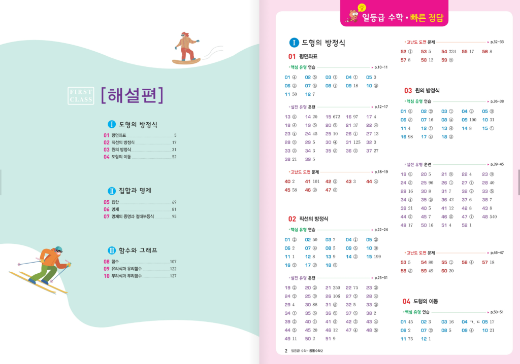 일등급 수학 공통수학 2는 2022 개정 교육과정을 반영해 공통수학2 전 범위를 한 권에 담은 실전형 문제집입니다. 평면좌표와 직선·원·도형의 이동을 다루는 ‘도형의 방정식’, 집합·명제·증명과 절대부등식을 묶은 ‘집합과 명제’, 함수의 개념에서 유리·무리함수까지 확장하는 ‘함수와 그래프’로 축을 세워, 내신에서 반복 출제되는 핵심과 수능에서 요구하는 해석력을 동시에 기르도록 설계했습니다. 단원 간 연결이 자연스러워 좌표기하–논리–함수 사이를 오가며 문제를 보는 시야를 넓힐 수 있습니다. 아래 일등급수학 공통수학2 답지를 올려두도록 하겠습니다. 표지를 꼭 확인하시길 바랍니다.