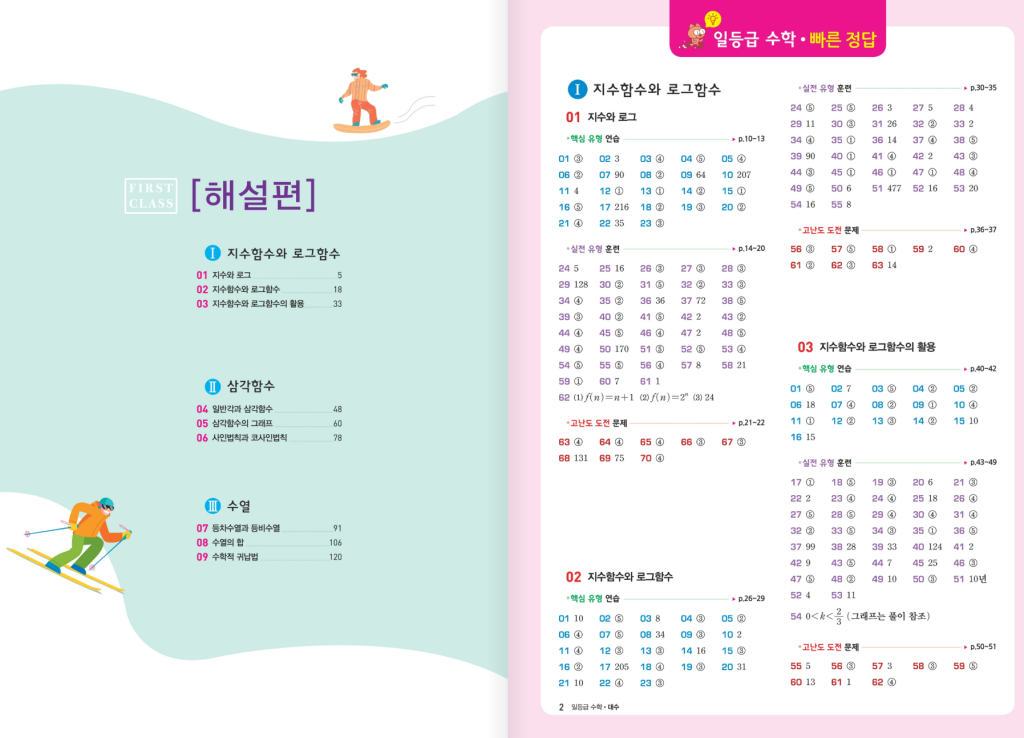 일등급 수학 대수(2026년)은 2022 개정 교육과정을 기준으로 지수·로그, 삼각함수, 수열 전 범위를 한 권에 압축한 실전형 문제집입니다. 내신에서 반복되는 기본기와 수능에서 요구하는 해석·논증력을 동시에 겨냥해, 개념→유형→실전으로 이어지는 학습 동선을 깔끔하게 설계했습니다. 단원 구성은 지수함수·로그함수의 성질과 활용, 일반각과 그래프, 사인·코사인 법칙, 등차·등비수열과 귀납법까지 이어져, 고등 대수의 핵심 토픽을 빠짐없이 점검할 수 있습니다. 아래 일등급수학 대수 답지를 올려두도록 하겠습니다. 교육과정이 바뀌었으므로 표지를 확인하시길 바랍니다.