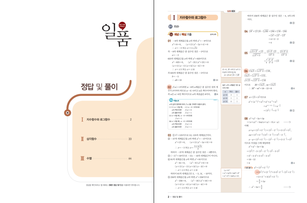 위 링크를 통해 22개정교육과정 대수 일품 답지를 열람할 수 있습니다. 문제 구성은 출판사 소개처럼 “개념&핵심 기출”을 기반으로 “1등급을 위한 고난도 문제”, “1등급을 결정하는 사고력 통합 문제”, “1등급을 굳히는 실전 마무리 문제”로 이어지는 단계형 구조를 가지고 있습니다. 처음에는 학교 시험과 모의고사에 자주 등장하는 필수 유형으로 개념을 점검하고, 점점 조건이 복잡해지는 고난도와 사고력 통합 문제로 넘어가면서 킬러에 가까운 문제까지 연습할 수 있습니다. 특히 지수·로그, 삼각함수, 수열은 수능에서도 꾸준히 출제 비중이 높은 단원이라, 이 책에서 고난도 문제까지 소화해 두면 이후 수능 준비에서 큰 도움이 됩니다
