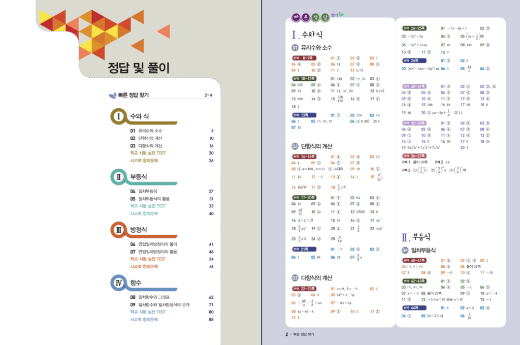 단원 구성은 수와 식, 부등식, 방정식, 함수 네 부분으로 나뉩니다. 앞부분에서는 유리수와 소수 계산, 단항식과 다항식의 사칙연산을 통해 연산 실수를 줄이고 식 정리 감각을 기를 수 있도록 되어 있고, 이어지는 부등식 단원에서는 일차부등식과 그 활용 문제를 통해 부등식 풀이와 해석 연습을 충분히 하게 됩니다. 연립일차방정식 단원에서는 여러 조건을 식 두 개로 정리해서 풀어 내는 연습을 반복하게 되고, 마지막 함수 단원에서는 일차함수와 그래프, 일차함수와 일차방정식의 관계를 연결해서 이해하도록 구성되어 있습니다. 이런 흐름 덕분에 연산, 식, 부등식, 방정식, 함수가 따로 놀지 않고, 하나의 큰 흐름으로 이어지도록 연습할 수 있습니다.