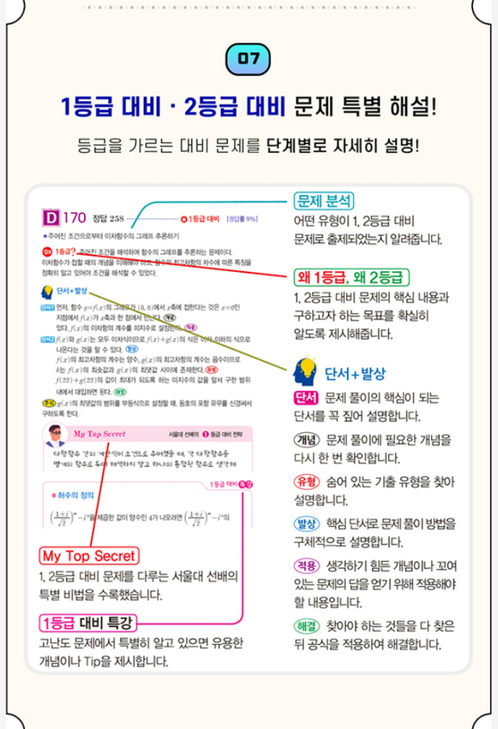 공부할 때는 처음부터 어려운 문제로 달려가기보다, 유형의 첫 문제에서 이 유형은 어떤 단서가 나오면 어떤 개념을 쓰는지를 먼저 잡고 다음 문제로 넘어가는 방식이 좋습니다. 이 책은 각 유형에서 쓰는 개념과 공식, 접근법을 난이도별로 정리해 두고, 해설에서는 해결 단서와 풀이 단계를 자세히 보여주기 때문에 혼자 공부해도 복습이 잘 됩니다. 특히 고난도 문항은 등급별로 구분해 분석하는 흐름이 있어서, 1등급을 노릴 때 어떤 발상까지 준비해야 하는지도 감을 잡을 수 있습니다.