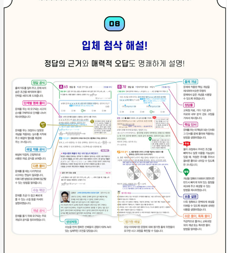 해설의 장점도 분명합니다. 단순한 정답 풀이가 아니라, 어떤 단서를 보고 어떤 개념을 떠올려야 하는지를 단계적으로 설명해 주기 때문에 사고 과정을 따라가기 쉽습니다. 고난도 문제는 1등급, 2등급 대비로 구분해 핵심 발상과 적용 방법을 따로 짚어 주어 상위권 학생에게도 도움이 됩니다. 다른 풀이와 보충 설명을 함께 제시해, 한 문제를 여러 각도에서 바라보는 연습이 가능하다는 점도 좋은 평가를 받고 있습니다.