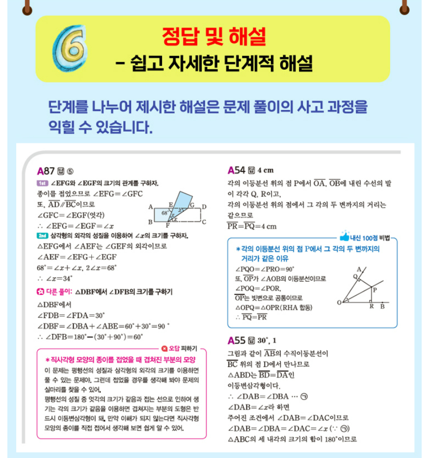 위 링크를 통해 Xistory 중등수학 2-2 답지를 열람할 수 있습니다. 이 교재의 장점은 유형을 아주 잘게 쪼개서 학교 시험에서 나올 법한 상황을 빠짐없이 연습하게 한다는 점입니다. 예를 들어 닮음에서는 닮음비를 구하는 문제만 있는 게 아니라, 길이와 넓이 관계를 연결하거나 도형 안에 숨어 있는 닮음을 찾는 문제까지 단계적으로 올라갑니다. 서술형도 어떤 순서로 써야 점수가 나는지를 연습하게 해 주기 때문에, 풀이를 말로 설명해야 하는 문제에서 도움이 됩니다. 오답률이 높은 유형을 반복하게 해 주는 구성도 있어서, 자주 틀리는 패턴을 줄이는 데 맞춰져 있습니다.